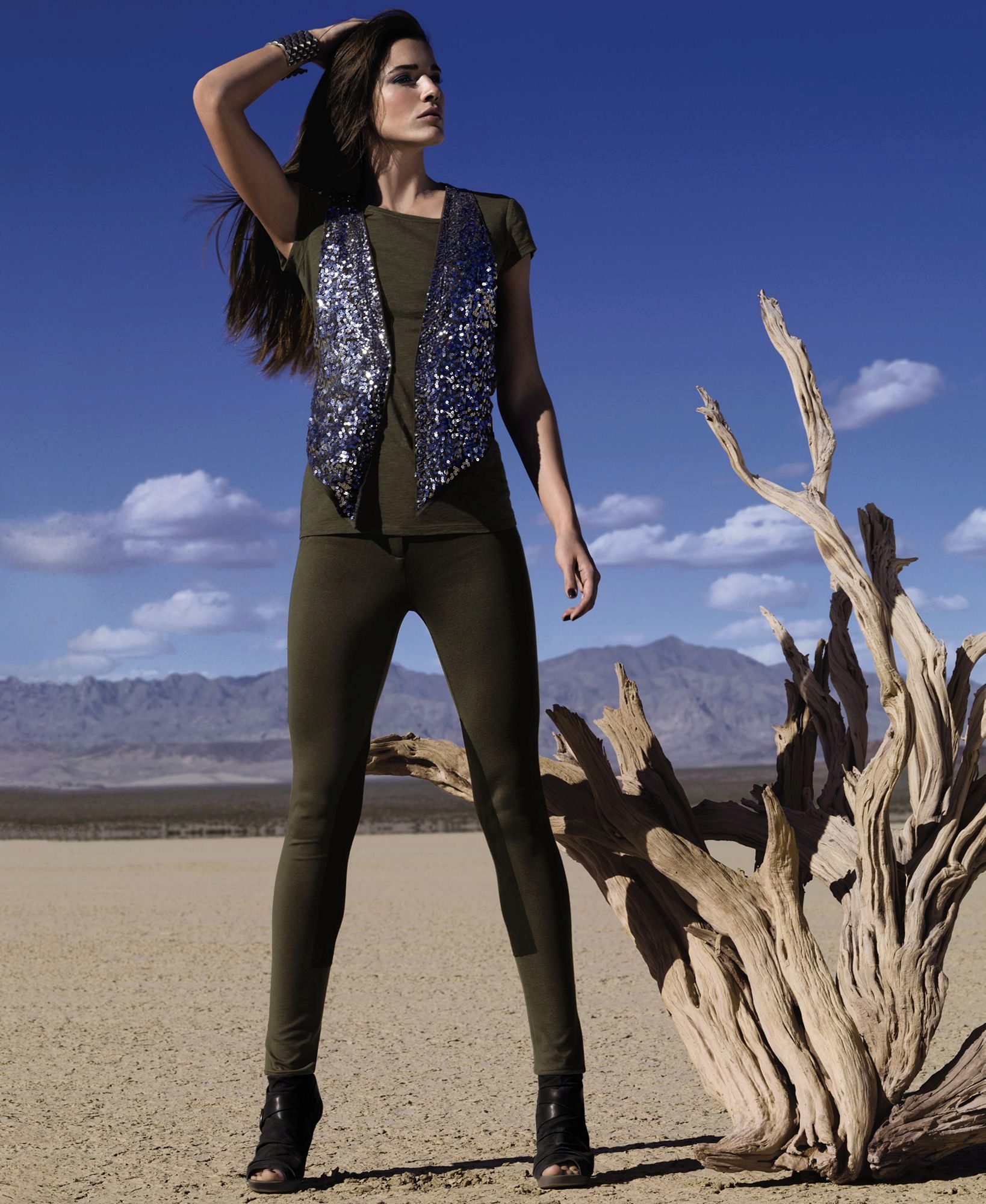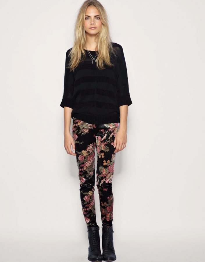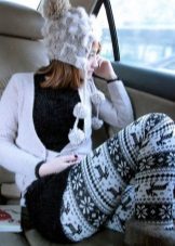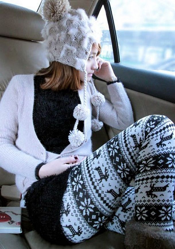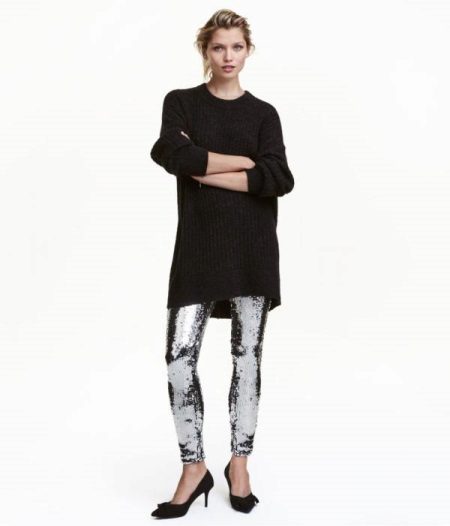 • Impression leggings give sequins silver. It looks elegant, but in this case, in combination with a dark knitted sweater, a bright casual style was created.