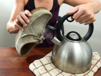 In the elimination of specks will help semolina, which perfectly cope even with stubborn dirt. The plot is filled with semolina and rubbed with a metal brush. If this tool did not help, you can split the stage into two parts. To start, you need to hold the shoes over the steam, and then again fall asleep with grain. In order not to suffer from the pots, a steam bath can be arranged over the spout of a boiling kettle. The minus of the saucepans is that the steam will be supplied from too large a surface, as a result of which you can get burned.