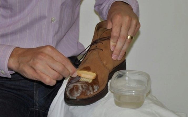 The first step is to clean the surface of the shoe by removing dust with a soft cloth or sponge. You can also use a soft brush or a school eraser for cleaning. In the case of a very terrible state of their shoes should be washed with soapy liquid. The sponge is rubbed with household soap or baby soap, rinsed gently with water and foamed well. That foam will help get rid of the dirt under the pile. On the surface you need to gently walk with a sponge, then wipe with a rubber brush.It is important to prevent strong suede soaking, otherwise the whole process will be in vain. In the absence of the desired home soap, it can be replaced with shower gel or detergent.
