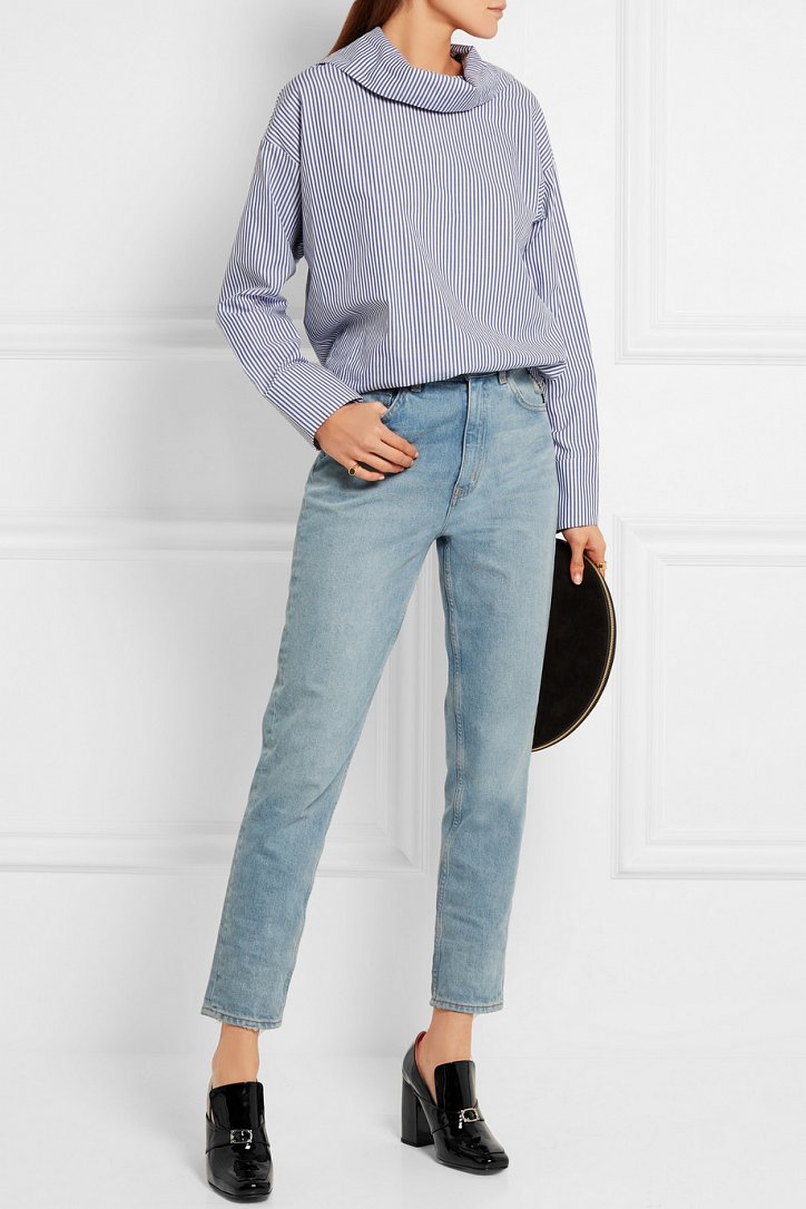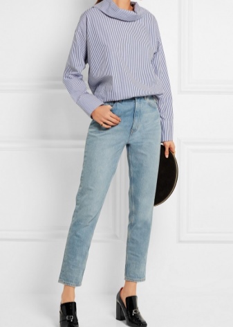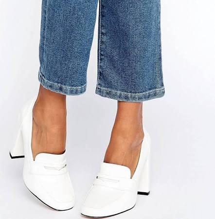 - Loafers with heels look great with pants and jeans. It can be any model - a classic will be appropriate in the office, narrowed or flared fit every day, and if you want to produce an unforgettable effect, choose loose culottes.
