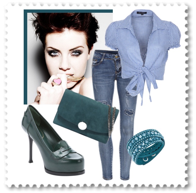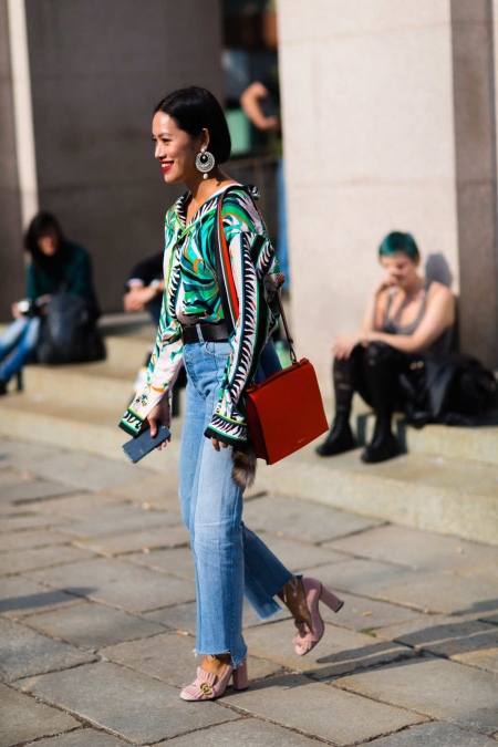 Stylish look for meeting with friends or going to the cinema, which is easily transformed into an office and vice versa. Blue straight cut jeans, a bright print shirt, pale pink suede high-heeled loafers and a bright red handbag-tablet. The image complements the wide black belt, red lipstick and massive earrings.