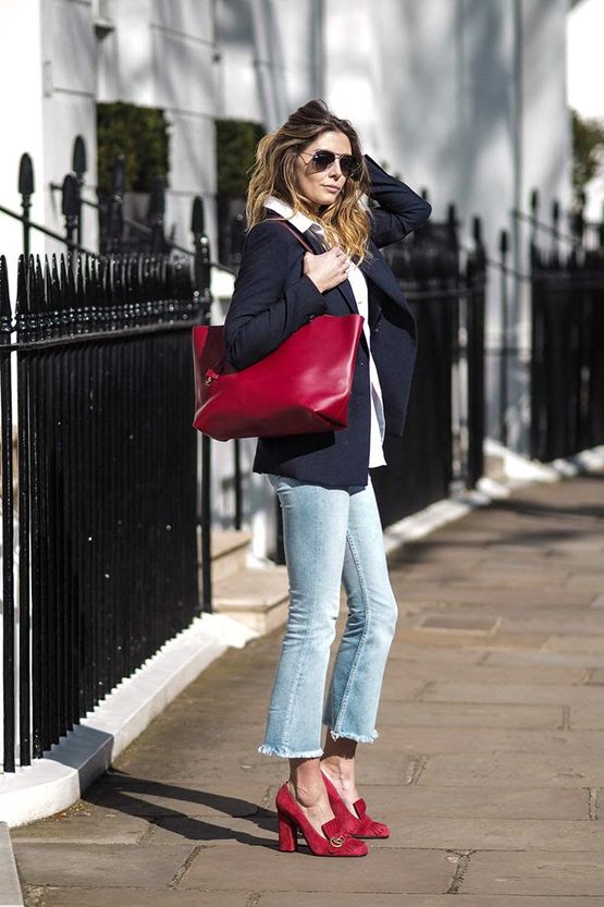 Modern business image that will suit girls who are not in the framework of a strict business dress code. Cropped flared jeans, a white shirt with a navy shirt, a navy blazer, suede cowberry-lined heels and a leather tonal-style shopper bag. Look complement stylish aviator glasses.