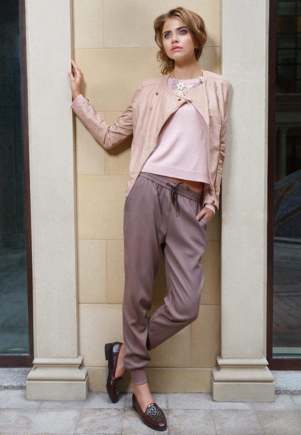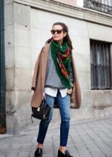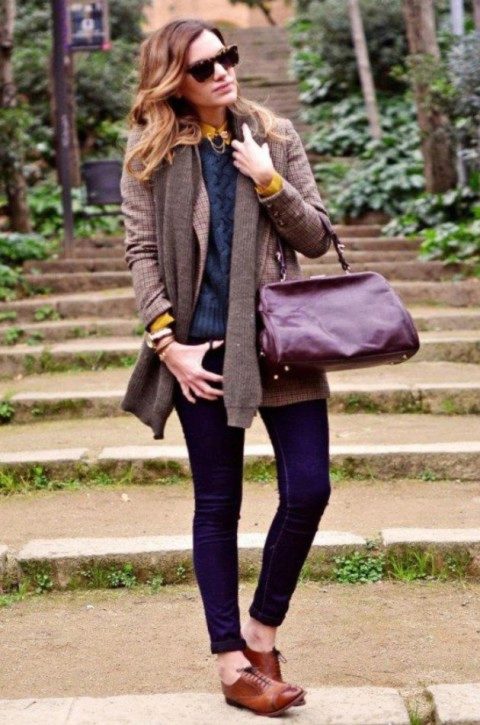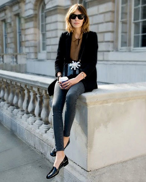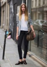 For walking around the city, loafers in combination with skinny jeans and spacious riding will be simply indispensable. In cool times, a trench coat, a cardigan, and even a khaki-colored jacket will be a wonderful end to the look.