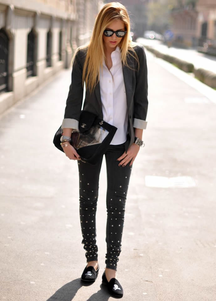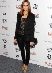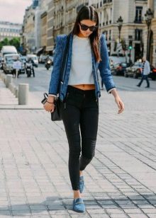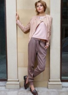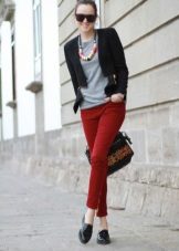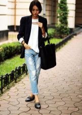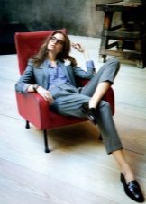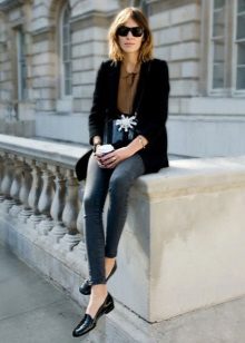 Lovers of the office image is also not necessarily give up loafers. They are perfect black pants in classic length, combined with a plain top or blouse and a checkered jacket. The color of the shoes is selected individually, but the most popular options are black, cherry or gray.