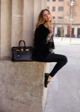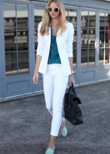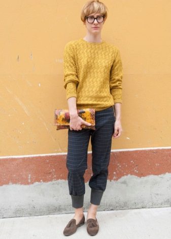 Cropped black pants blend perfectly with loafers. The top is selected monophonic - white, beige, delicate shades of mint, pink or blue. Jumpers, white fitted shirts, short coats are suitable for the top. The latest fashion is elongated knitted sweaters.