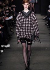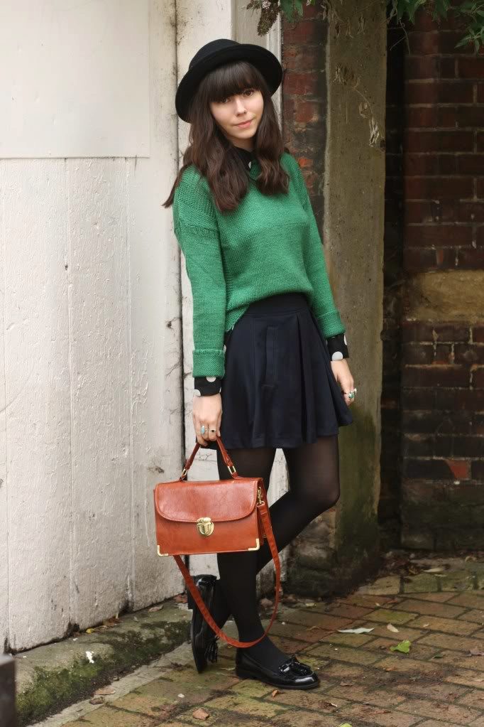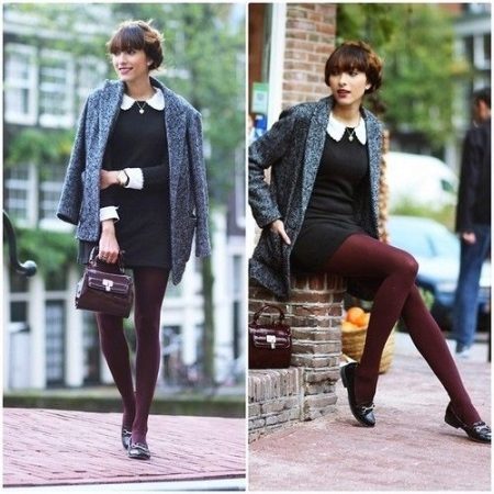 The autumn and winter season is a boom for loafers and knitted dresses.. Warm dresses of gray, light pink, blue and beige shades are in harmony with dense monophonic tights without a pattern. A coat and a volume scarf are an integral part of this look. The shoes should be dominated by dark and rich colors.