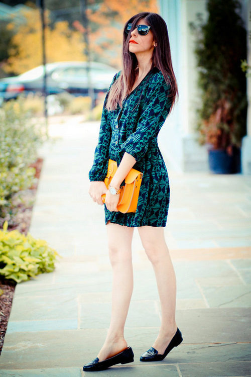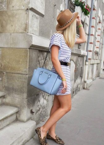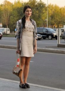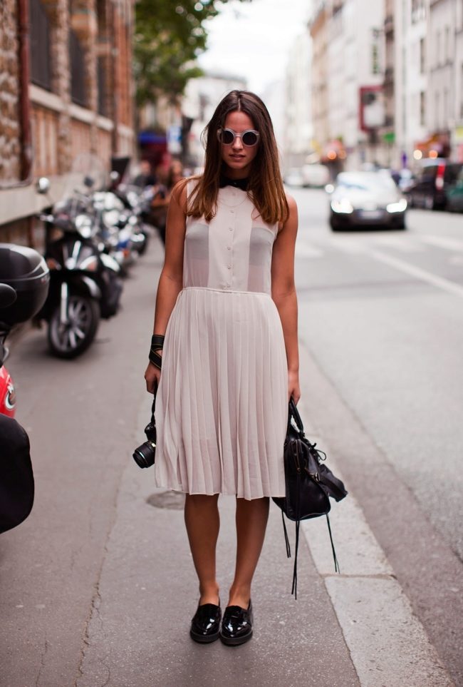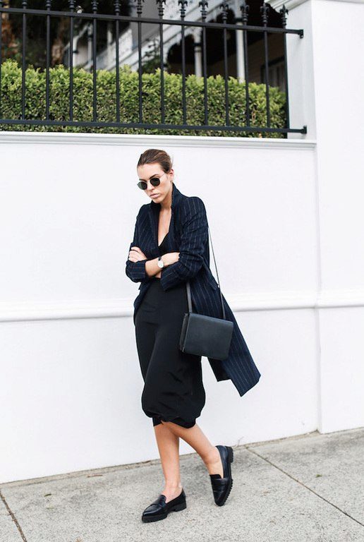 Another fashionable combination is loafers with sheath dress. It is desirable that the dress was monophonic. The image can be added with confidence with different accessories, as the dress looks simple and elegant. The selection of shoes in this case depends on the shade of your outfit.If the shoes are bright, then the top should be calm. Graceful boleros, light air capes, jackets will suit the dress-case and loafers.