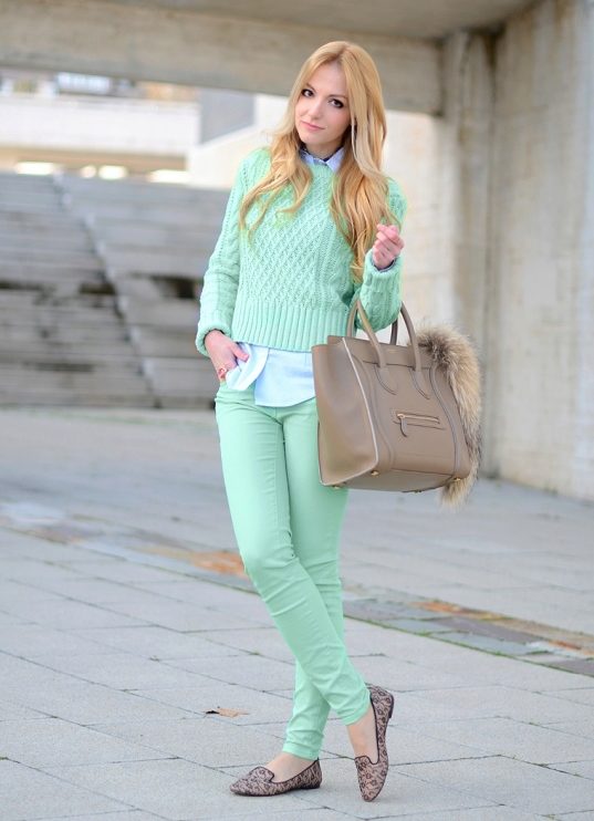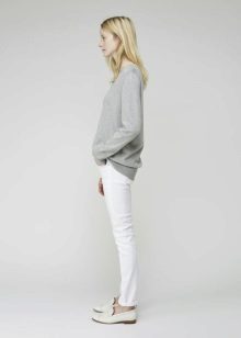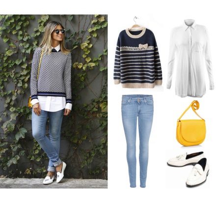 White loafers are a real find for those who love freedom of dress. White shirt of loose fit in combination with a spacious sweater with a pattern has become a new trend of street fashion. You can add a colored handbag on the strap.