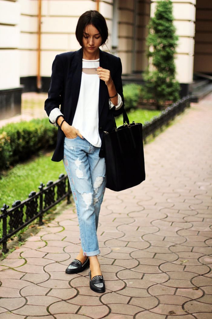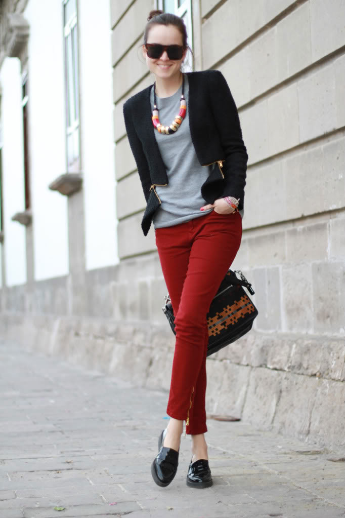 Those who do not like black trousers, you can easily replace it with a dark emerald, burgundy, cherry. With such combinations it is allowed to wear dark colored loafers. No less stylish combination are cropped blue jeans with a dark blouse. The top can be both free and tight. An interesting highlight is the volumetric scarf and cardigan.