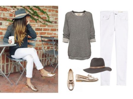 One of the latest fashion styles is golden and silver loafers. They are like nothing else to create a romantic look for a date. They are beautifully combined with white and beige trousers with tucked cuffs, as well as with a thick wool sweater. There will not be an extra soft hat with brim.
