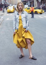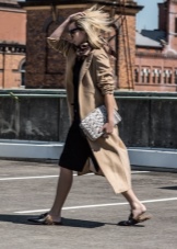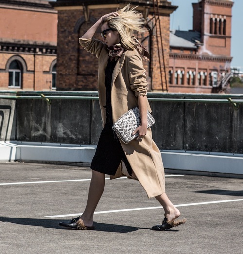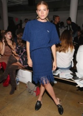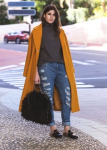 In the cool season, the combination of loafers with fur and knitted dresses is important. Here dense monophonic tights without a pattern are appropriate. The ensemble will complete a coat and a volume scarf.