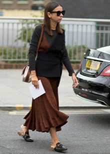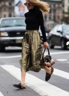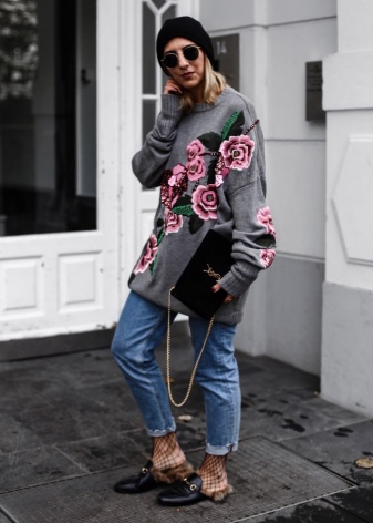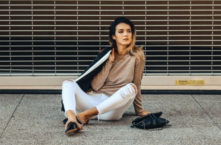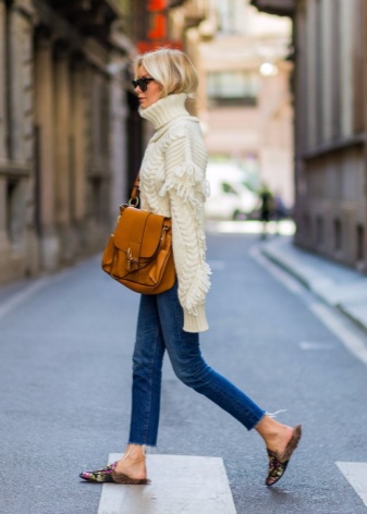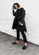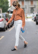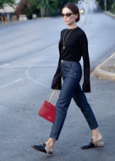 Cropped trousers are considered ideal for loafers. The top in this case should be monophonic. This may be a jumper, a fitted shirt or a blouse. Interestingly in such a dress look elongated knitted sweaters.