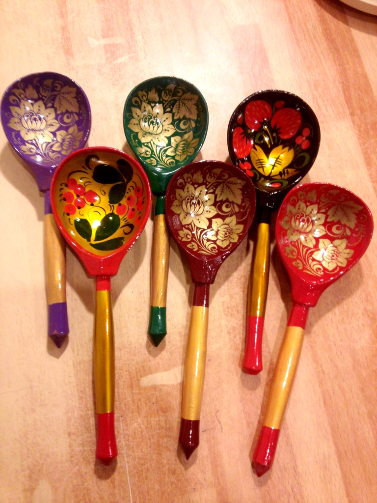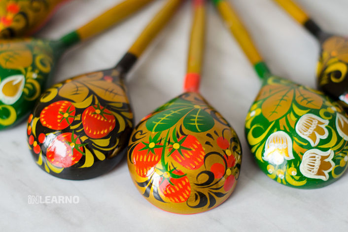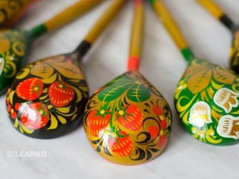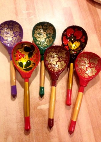 The painting is done with small brushes, no more than 6, the best option is squirrel. The drawing should not be impromptu unless you are a master. Draw a sketch in advance, transfer it to a spoon. Apply the paint in one go! Patterns can be simple, and can make a more elegant fine work. But for this, a sketch in color must first be done on paper: the hand will be trained, and already on the spoon itself you will be able to apply a complex pattern without errors from the first time.