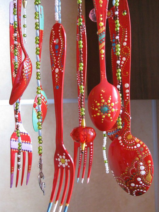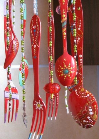 Decorate spoons and forks in one color - for example, red. For registration, use a nice dot painting. Cover the product with varnish and, waiting for it to dry, fasten on the fishing line / braid. For fixing in the spoons and forks, holes must be made in the handle.
