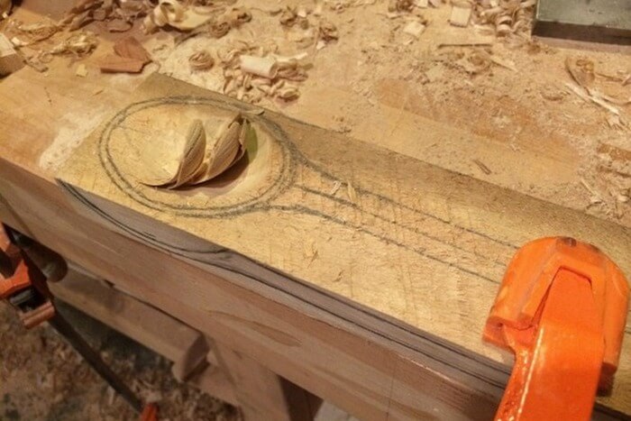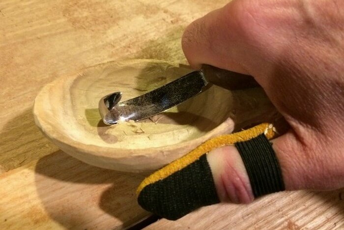 - Next, take the Bogorodsky knife, with which the convex part of the spoon is decanted. Thanks to the wide chisel, the cup can be shaped into a perfect evenness. Knife and chisel handle the shape of the handle.
