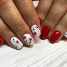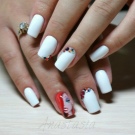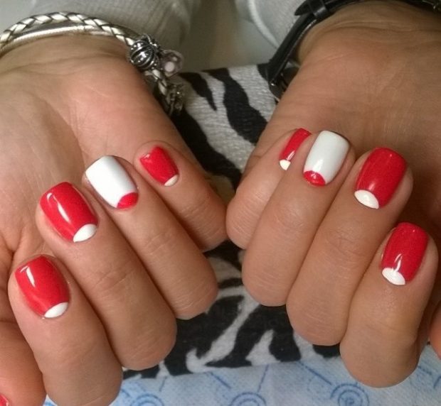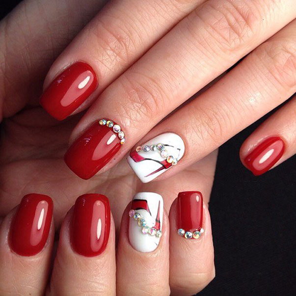 No less beautiful, and, moreover, refined, can be called a combination of white and red. A trio of white, red and black, with the addition of rhinestones or stones will make your nails flawless.