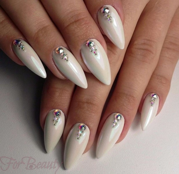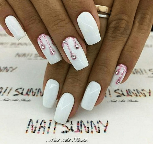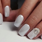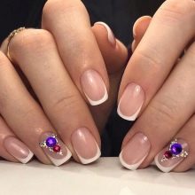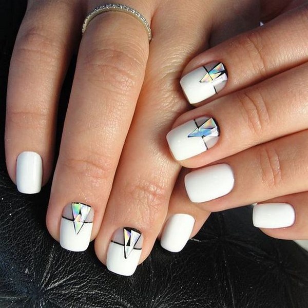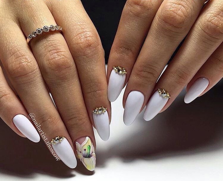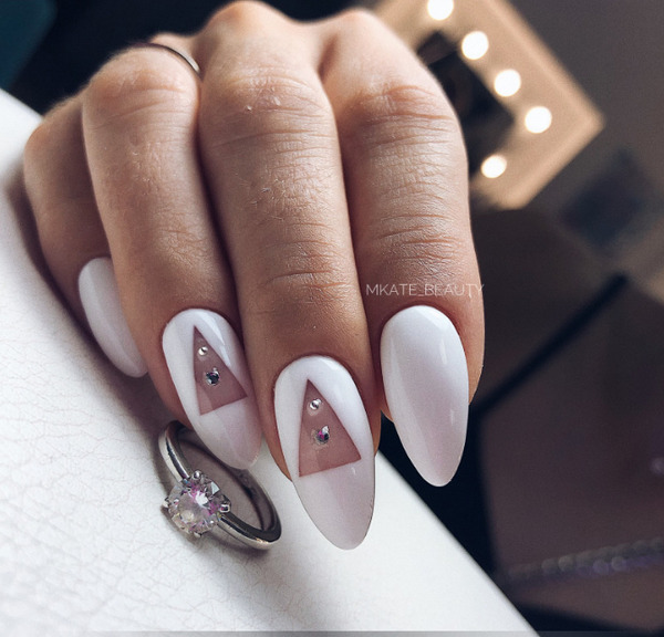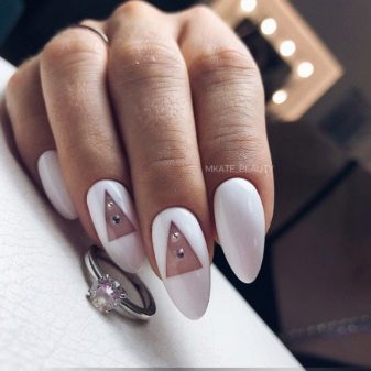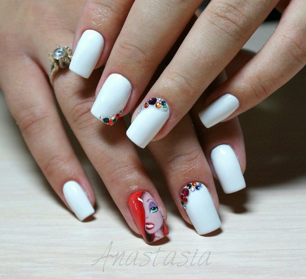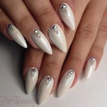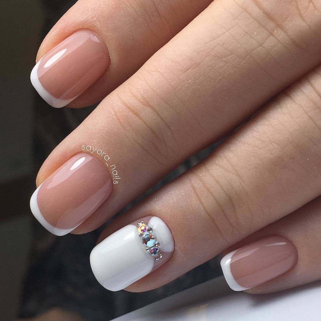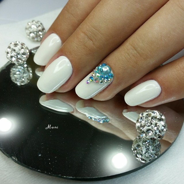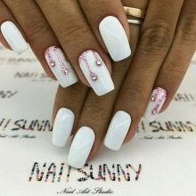 Rhinestones and pebbles on white look great. Currently there are a lot of them, in beauty salons you can find both transparent and multi-colored elements. Since the white color can be easily combined with any other color, for the design with rhinestones, you can choose any color you like, and at the same time the manicure will look harmonious.