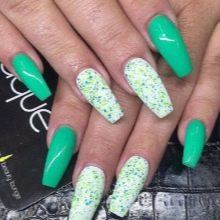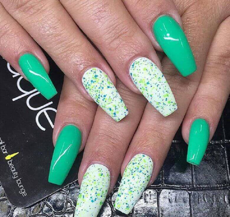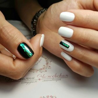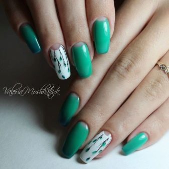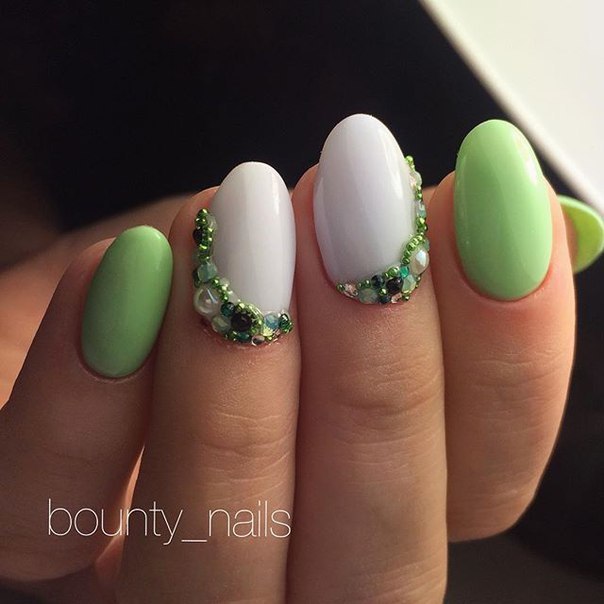 Nowadays, monochromatic coloring is very popular - a manicure in two tones of different colors. Due to this, the nails look very unusual and interesting. For example, earlier green lacquer was rarely used when creating manicure, especially in combination with white, but today the green color is quite relevant.