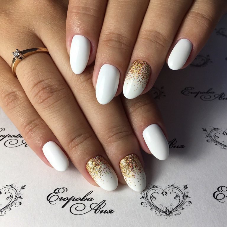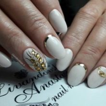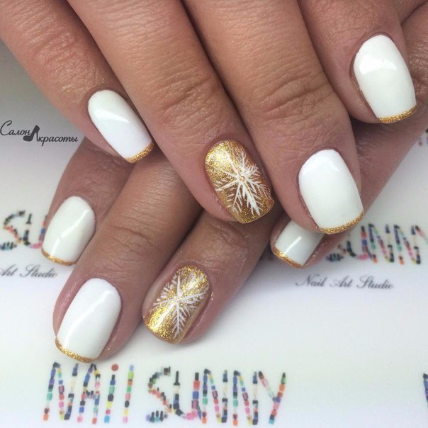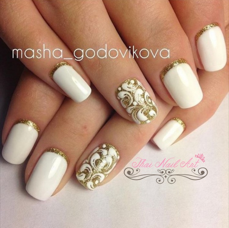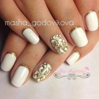 One of the most popular designs of white manicure is a manicure with gold splashes. On white lacquer golden patterns look extraordinarily beautiful and elegant.