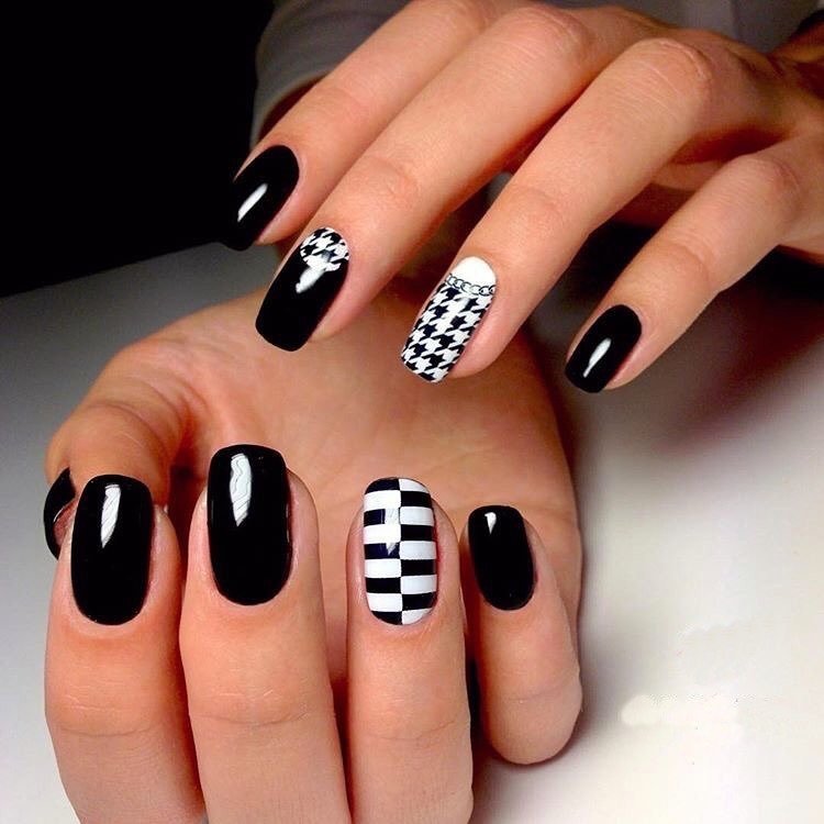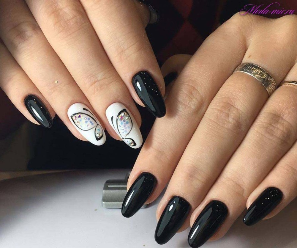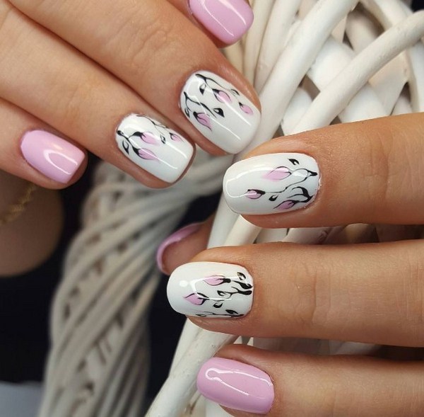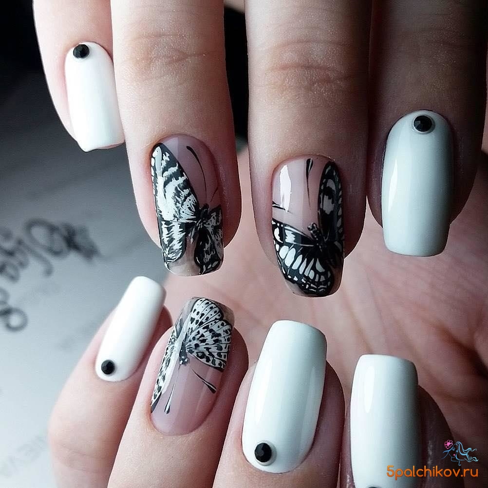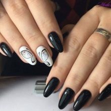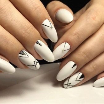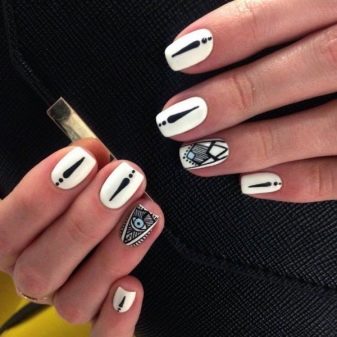 Classic design is a white manicure with black patterns and drawings. Here you can give free rein to fantasies, ranging from simple black dots to various ornaments and hieroglyphs.