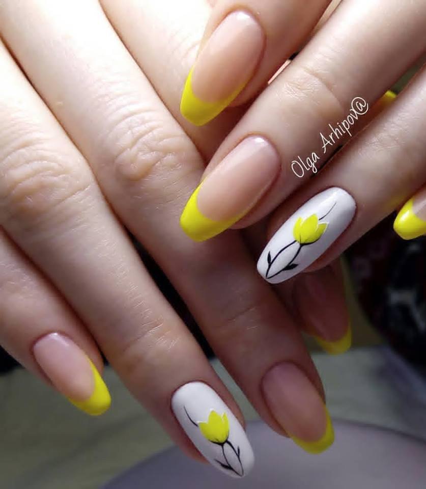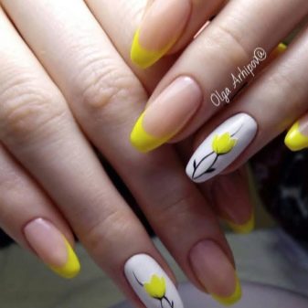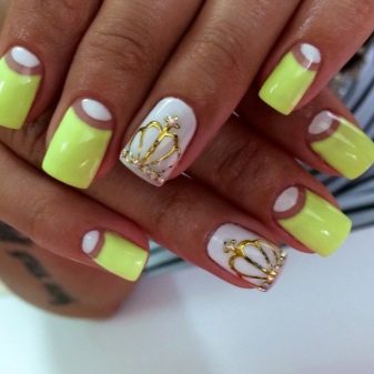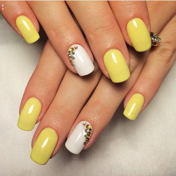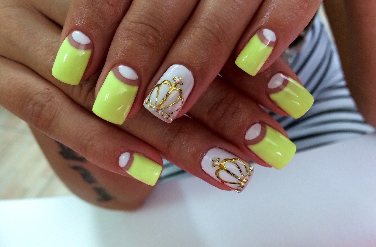 No less popular is the combination of white with yellow. Yellow varnishes, like green, have an incredible amount of shades, from light lemon to poisonous orange. And in combination with white, yellow can be both auxiliary and leading color. The yellow shade looks good on both short and long nails, but still it can be found more often on longer nails, as girls like to come up with various manicure designs with this color, and they need a little more space.