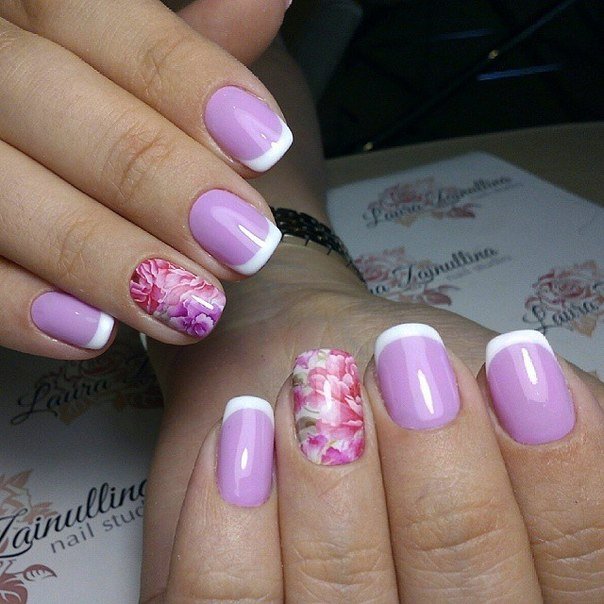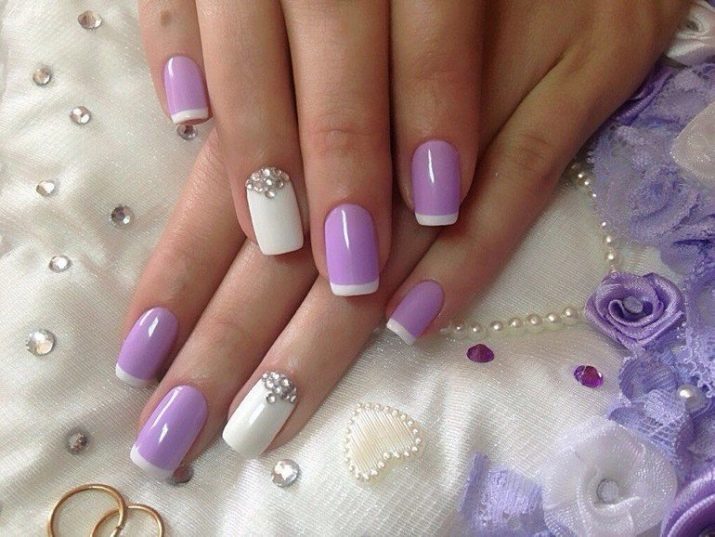 Currently, French manicure is considered to be very popular, using precisely lilac and white, rather than the classic pale pink. These colors look very tender and feminine.