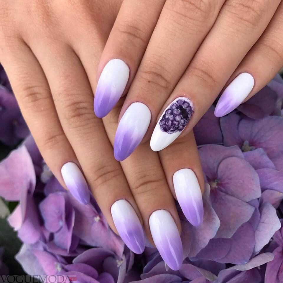 The gradient of white with purple or lilac is one of the most popular manicure design options, besides making it does not make any difficulties, you will need only a sponge or a piece of an ordinary sponge for washing dishes.
