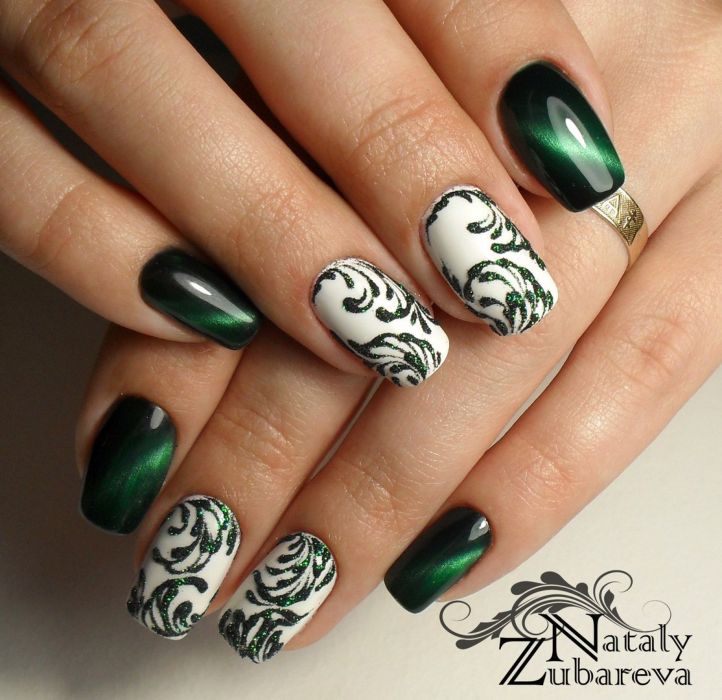 As mentioned earlier, almost any color will look perfect with white. There are incredibly many options for a beautiful combination of white and green. Many girls and women are inclined to believe that green is still more of a seasonal color, summer. But here are examples of a beautiful winter, New Year's manicure.