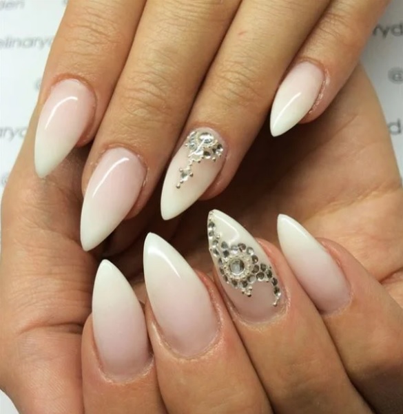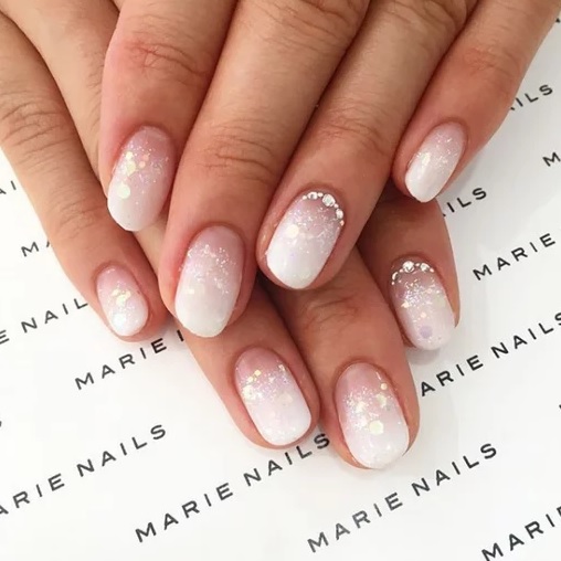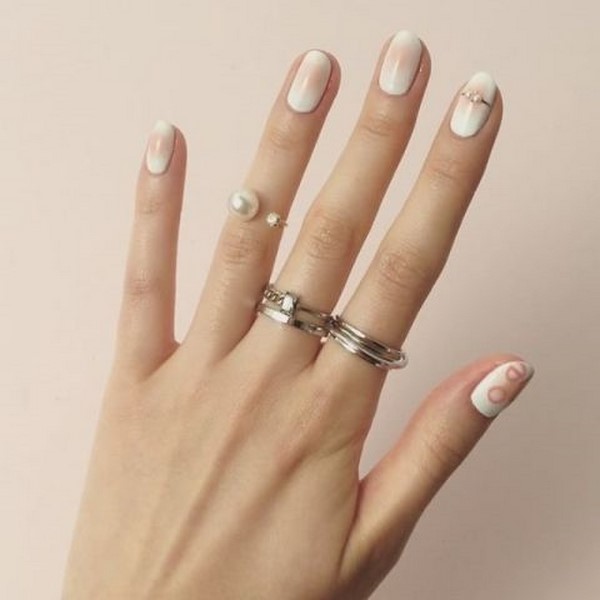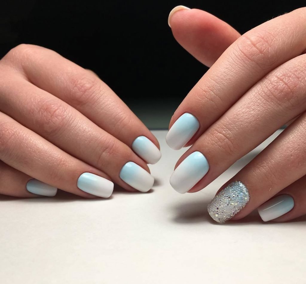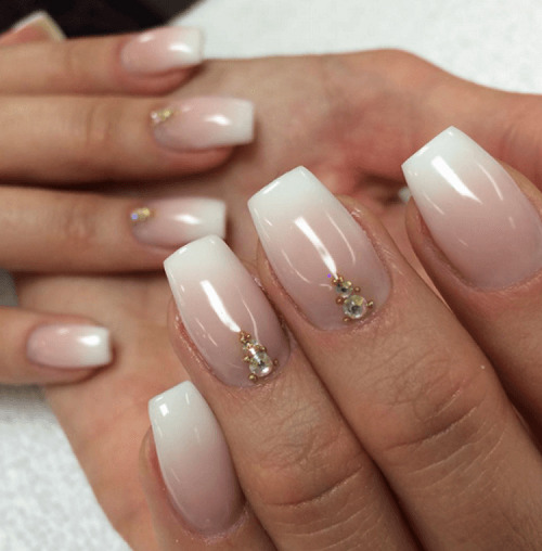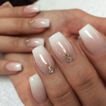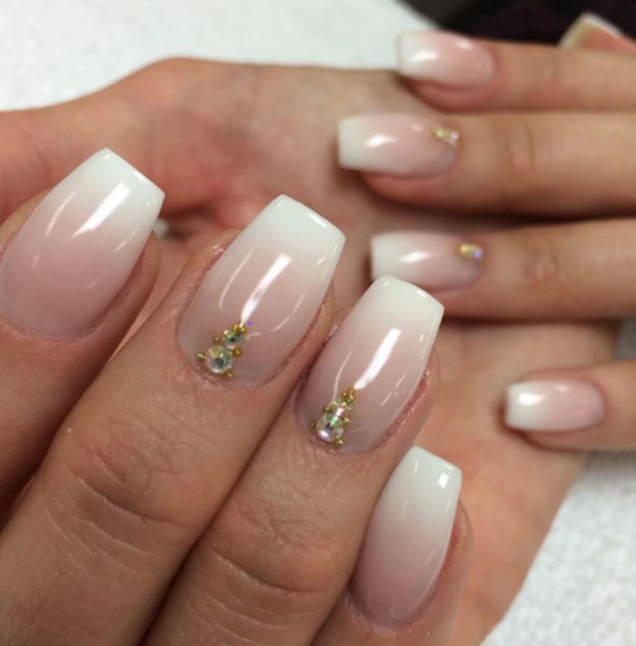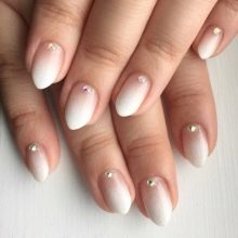 In addition, the white gradient on the nails looks good with glitters and rhinestones, which in small quantities will be relevant during the daytime.