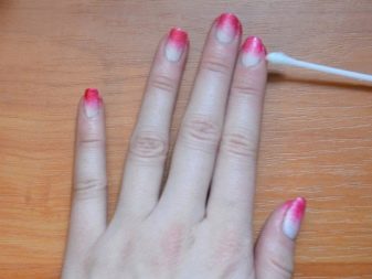 Further, using a palette and a brush for feathering, it is necessary to recreate all the transitions of the lacquer coating from tone to tone. In this case, the tips of the nails should use the darkest shades. This technique visually lengthens the nail plate.