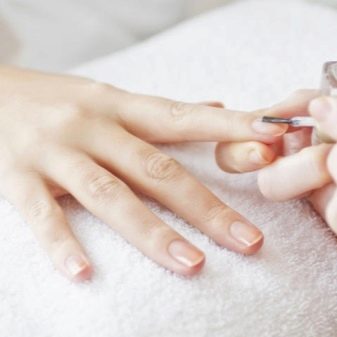 Sponge slightly moistened with water. This is done so that she did not have time to soak up the entire varnish at once. Dipping sponge into the finished lacquer composition several times, it is gently applied to the nail. At the same time it is necessary to avoid strong pressing, as deep prints from the sponge can remain. For a brighter manicure, you can still apply the composition to the surface several times.