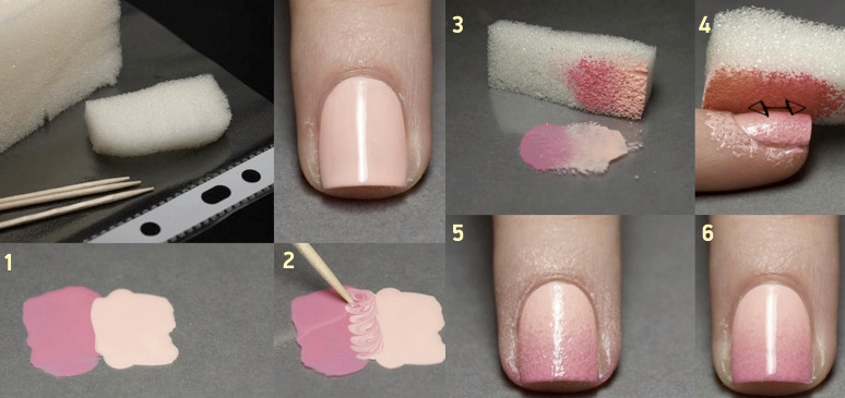 There are several ways to perform an ombre at home: smooth transitions of tones are obtained by feathering with a brush for decoration or with a sponge.