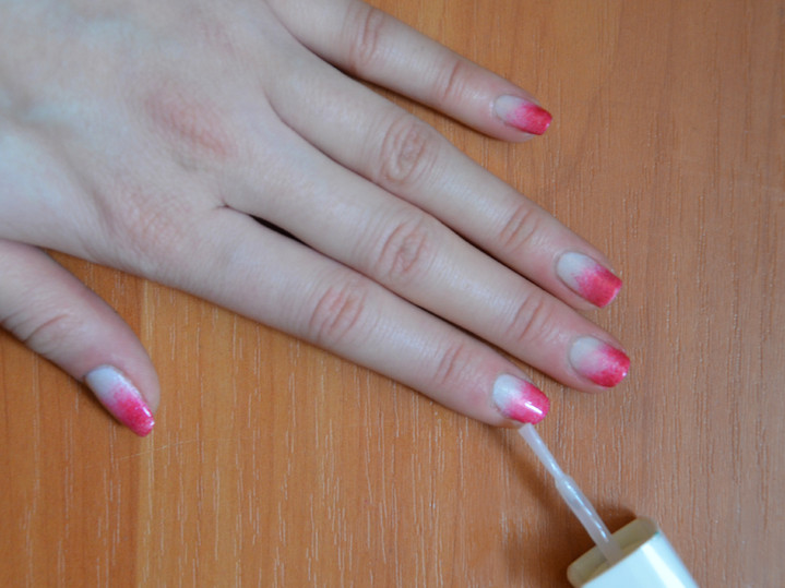 Next, the varnish should dry. After that, a fixer is applied to it, and the ombre manicure is ready.