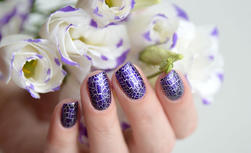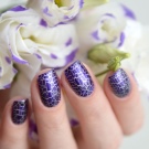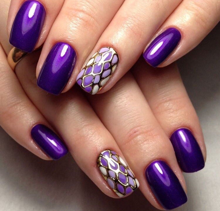 And you can also add other colors, such as gold lacquer or gold loose sparkles. A fashionable and unusual combination of purple lacquer with white craquelure or cat-eye effect.