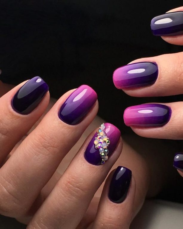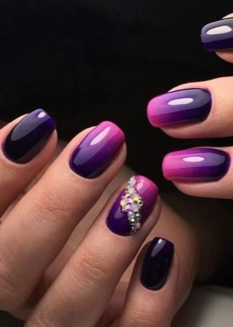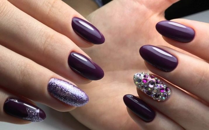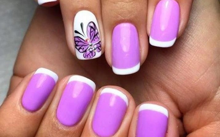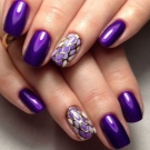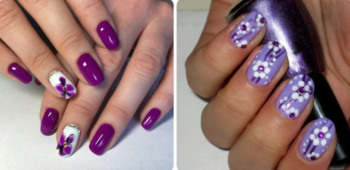 The most elementary version of the manicure - monochromatic with a full coverage of the nail plate can be varied, having painted some nails with violet varnish, and others white. If this option seems too boring, you can diversify it with rhinestones, stickers and other special decorative elements.