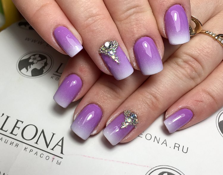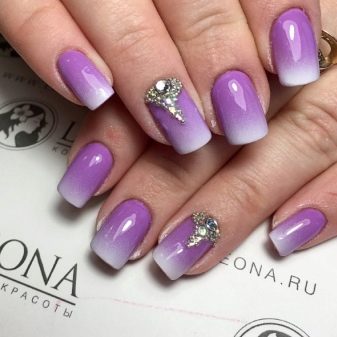 However, such a manicure is done with ordinary polishes or gel polishes with a sponge or similar means. And in the case of a combination of purple and white, the final version will be very impressive. So much so that no additional decorations will be needed and even unnecessary.