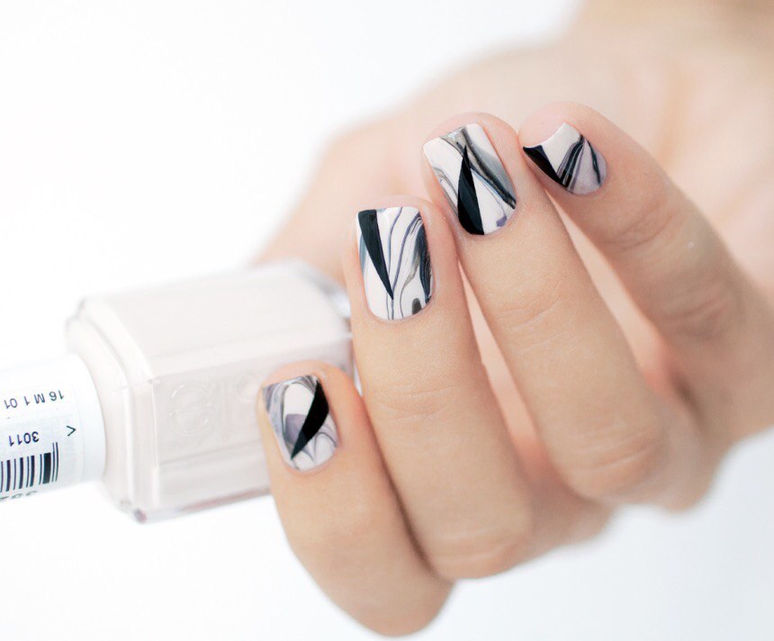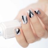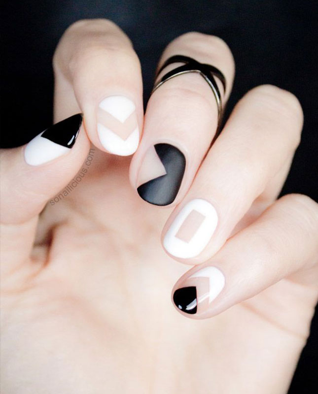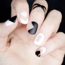 - Contrast and asymmetry. Every day the use of contrasting scales and asymmetry in manicure is gaining increasing popularity. Making marigolds snow-white manicure, you can safely "play" with shapes and colors. For example, white lacquer is permissible to combine with black peas or multi-colored triangles. Design options - a great many.