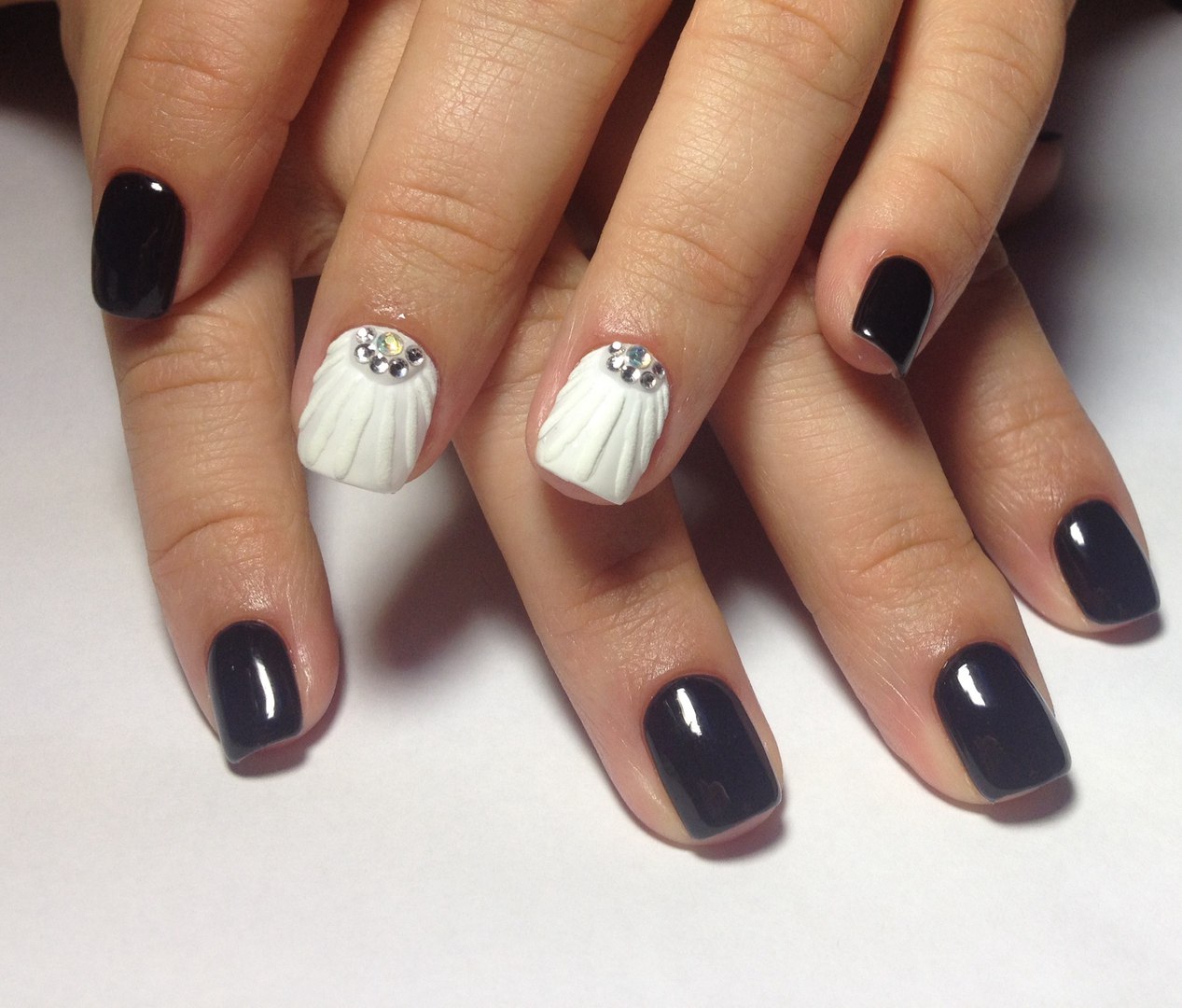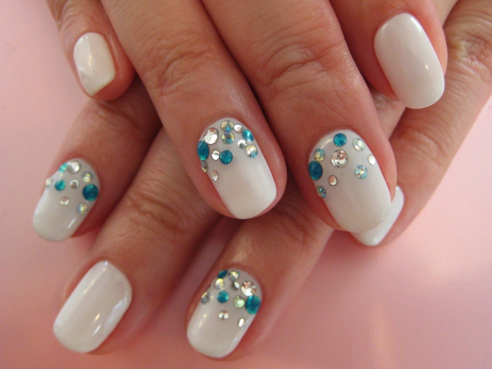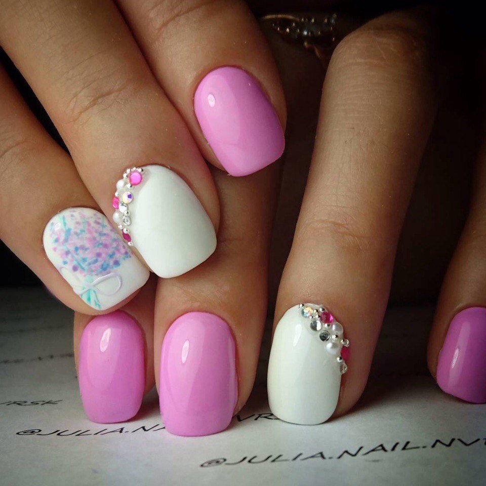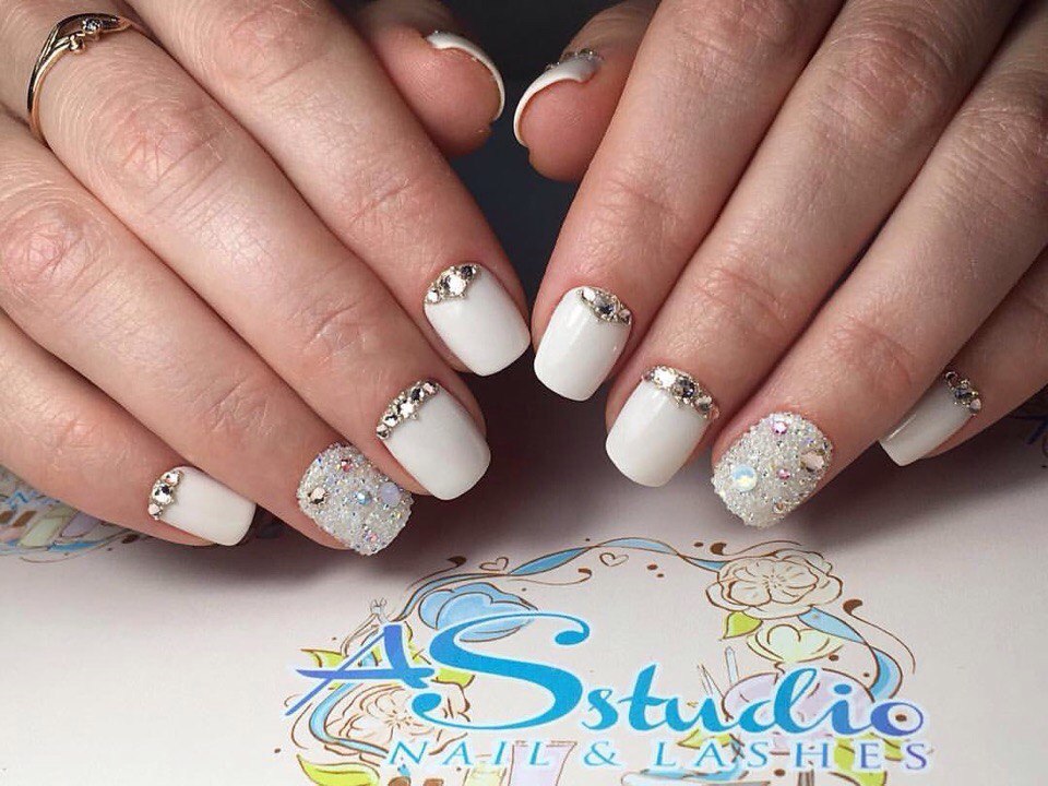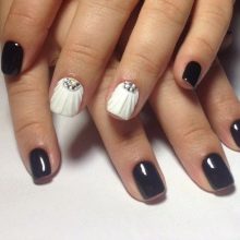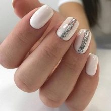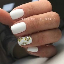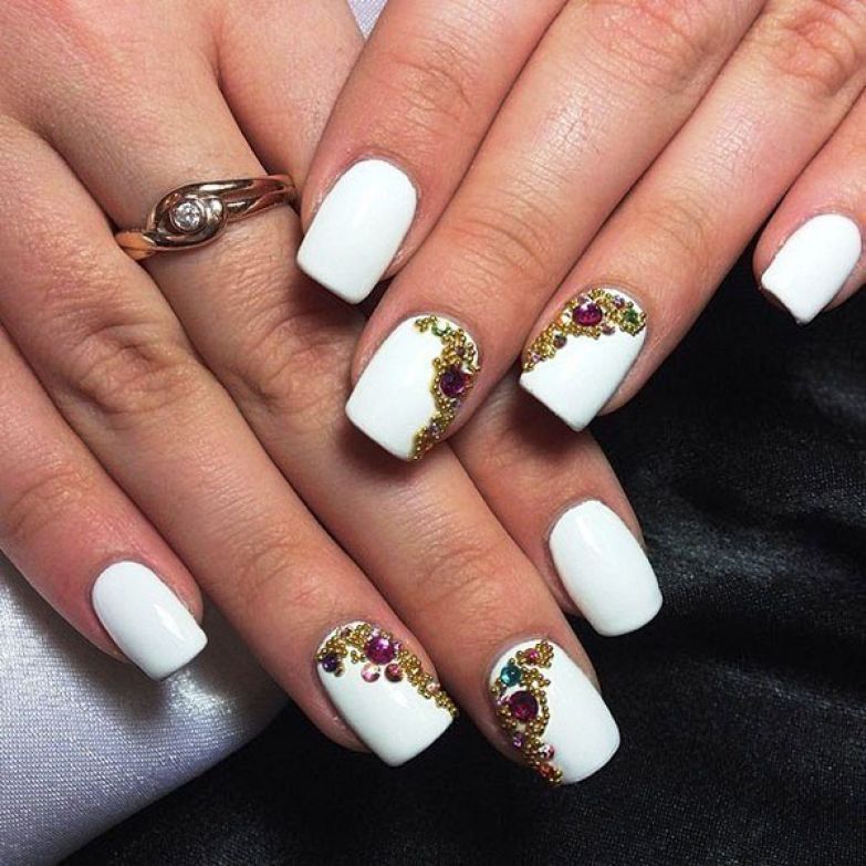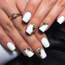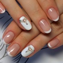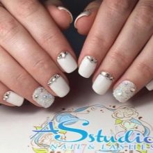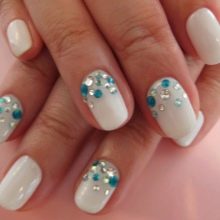 - With rhinestones. Fresh and original on ladies' nails looks snow-white lacquer, complemented by large shining rhinestones. This design has gained popularity relatively recently, but has already gained wide distribution. In addition to rhinestones, elements of artificial jewelry or small pebbles may be present on short nails. But you have to be careful with similar inclusions. On the nails of a small length of them should not be in excess, so as not to burden the manicure.