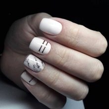 - To create such a concise, but stylish nail design, you need to use only high-quality brand varnishes. This condition is important to comply with, because in most cases, white lacquer falls heavily on the nails. In addition, a good and expensive white lacquer will not resemble a putty with an uneven surface.