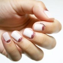 - Lunar. Recently so-called lunar manicure has been wildly popular. Such a design involves staining moonula marigold. If you refer to this fashionable design on short nail plates, you can create a very original manicure. It is recommended to make it using a suitable stencil: it will very carefully separate the crescent from the rest of the base.