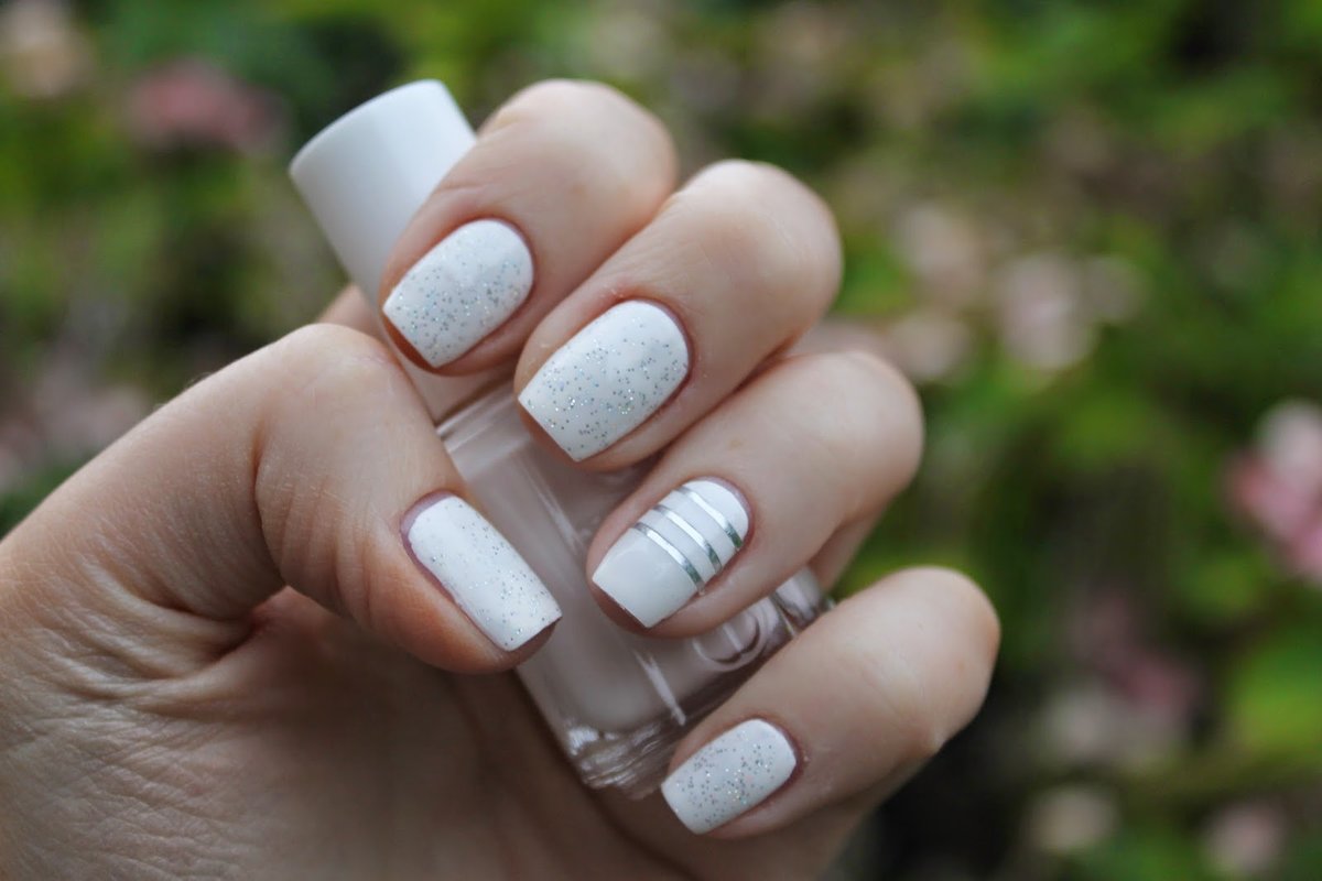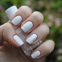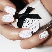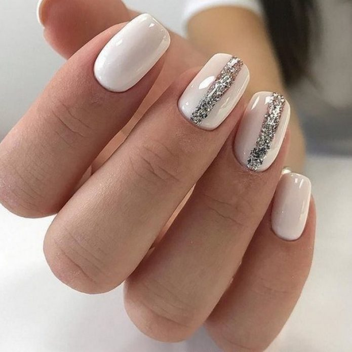 - Often, when applying white paint on the nails, small surface irregularities or noticeable defects are formed. You should not be afraid of such problems, but you need to fight them. This can help colorless varnish with glitter. It just needs to be applied in one layer on a white coating, and then thoroughly dried. Under the transparent layer all the irregularities of the white lacquer will be almost imperceptible, and the sparkles will make the manicure more “alive” and attractive.