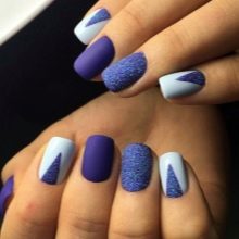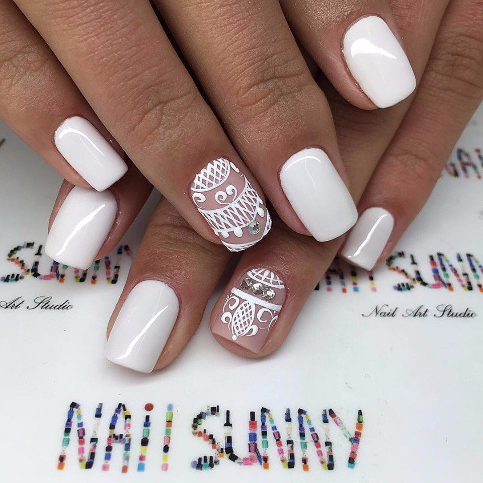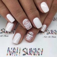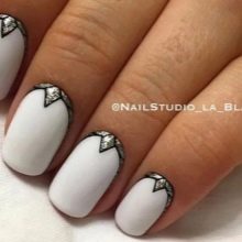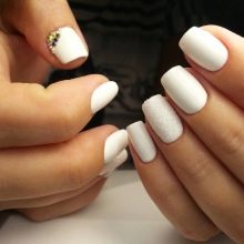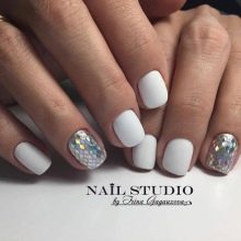 - Matt. White manicure with a matte texture is a fashionable and modern design of nails. Matte lacquer can be combined with glossy coatings, patterns, patterns, rhinestones or shiny stripes. The result will be an original and spectacular design, emphasizing the delicate taste of its owner.