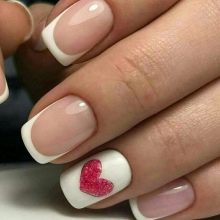 - French One of the most popular and tender is rightfully recognized as a manicure with the memorable name "French". In its traditional design, this design is not complete without white. It looks great on long and short nail plates. That is why it is chosen by many young ladies who want to emphasize femininity and lightness of the image. Often the specified manicure is complemented with snow-white sliders, and also used as a nail design for brides.