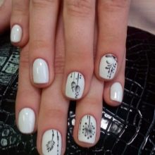 - With drawings. White lacquer is the perfect background coating. On it a variety of drawings and patterns look bright and expressive. Usually, the latter are applied using a special thin brush or a special stencil. The color scheme of the pictures can be different: from delicate to sharply contrasting and dark.