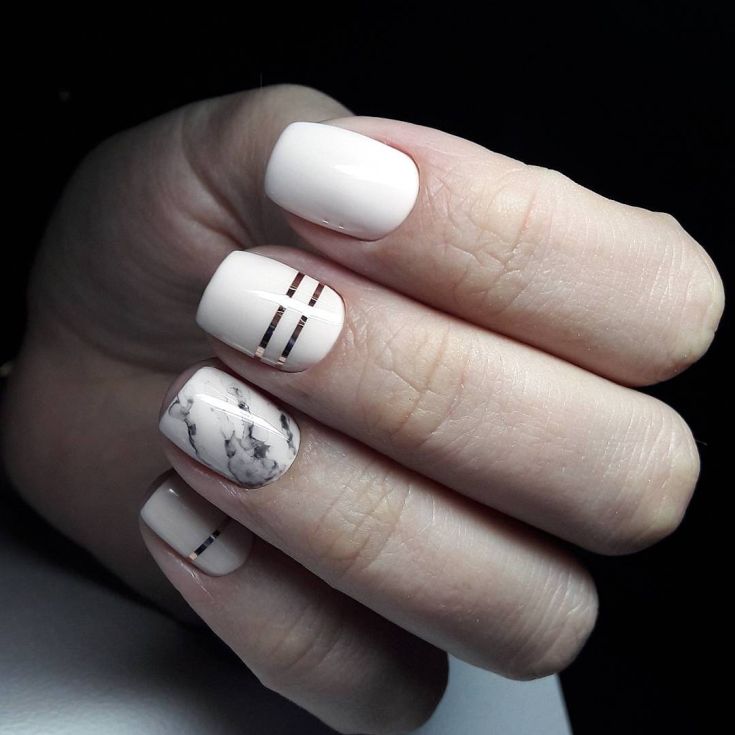 White manicure can be not only monophonic. It is permissible to supplement and other coatings. Fortunately, the classic white color blends seamlessly with most other scales. The result is very interesting and trendy combinations that attract a lot of attention. The most successful are the following tandems of colors: