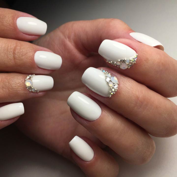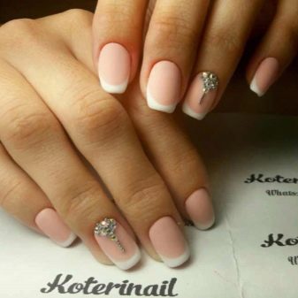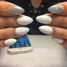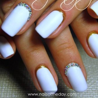You can simply paint the nails with a white matte varnish and on one or two out of ten fingers mark the cuticle area. Perfect for its emphasis fit small rhinestones. In this case, the bow of the inverted jacket can be not only traditional, but also asymmetric.