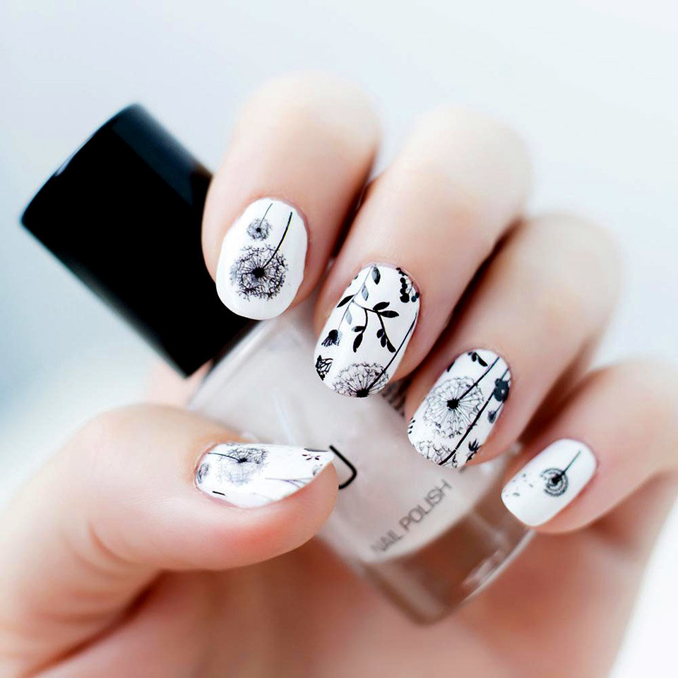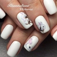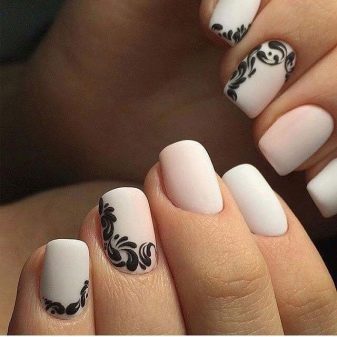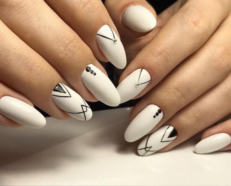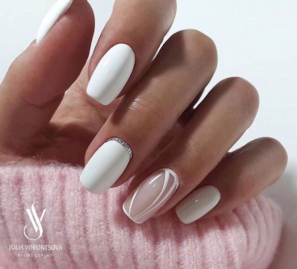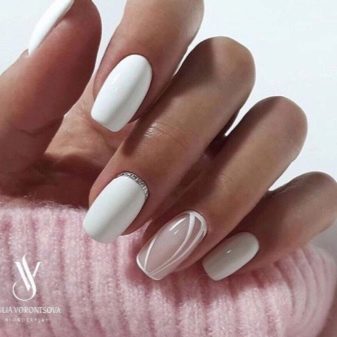 White color goes well with light gray, silver and black. Adding neutral contrasts allows you to change the perception of a manicure and make notes of the desired subject in it.