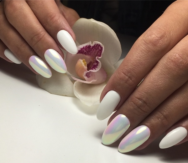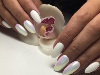 Each type of decor is different mood, which it fills the design. For example, rubbing can give a white pearl accent nail pearl effect, which today is considered ultrafashionable. With the help of powder, they create relief patterns, due to which the manicure acquires a special premium and extraordinary effect.