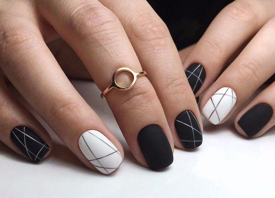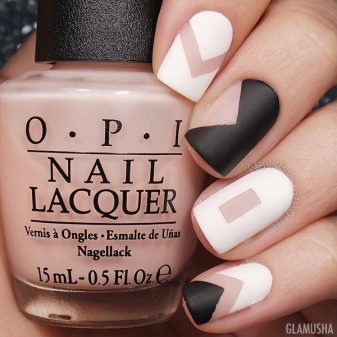 Matt color lacquer looks great in contrast with gloss. Today, the game of contrasts is one of the trends of the nail season. It is fashionable to paint thin and lace patterns on a matte basis with a glossy pigment. In addition, these patterns can be sprinkled on top of a special manicure powder or sugar. Due to this, even the most concise nail design is significantly transformed.