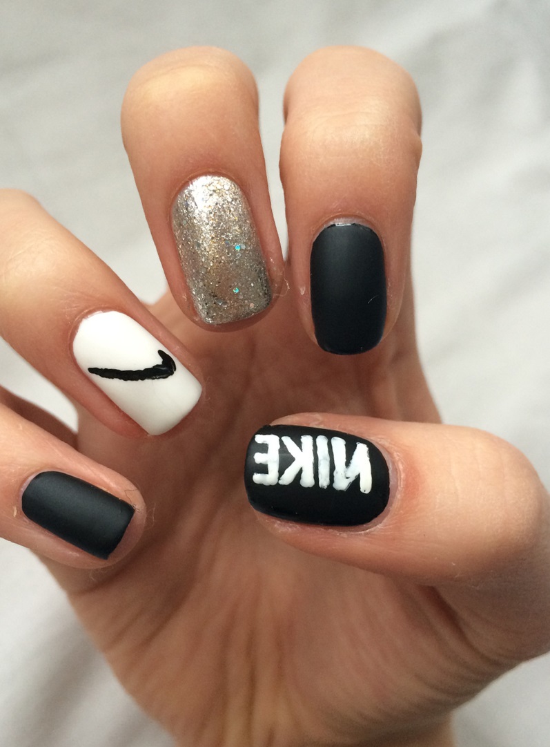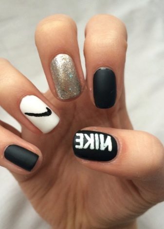 One of the trendy new white matte manicure has become logomania. Logos, strokes fashion houses on the nails in white look superstyle and clearly. And if silver or black gel is also added, this design looks particularly status.